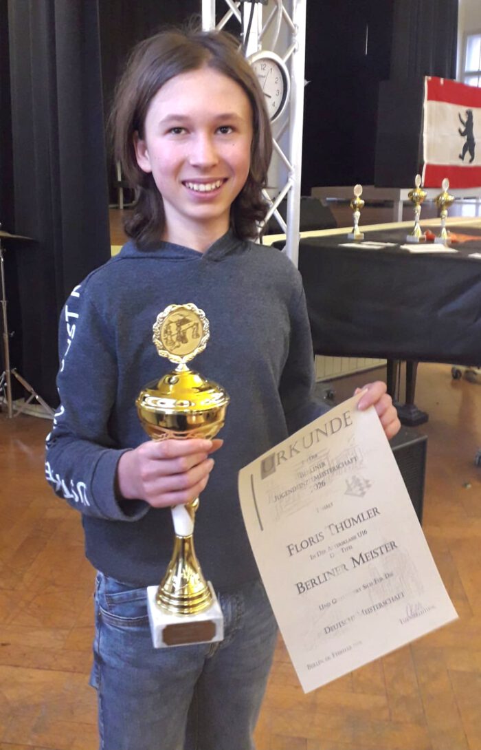 Unser Verein war nur in der U16-Meisterschaft beteiligt, dafür gleich mit 3 von 8 Spielern. Benjamin war bereits vorqualifiziert für das Finale, brauchte also nicht an den Vorrunden teilnehmen. Nastia und Floris schafften in der zweiten Vorrunde die Qualifikation. Wie üblich fanden in den ersten beiden Runden die vereinsinternen Paarungen statt. Floris konnte beide Partien gewinnen, während Benjamin und Nastia gegeneinander remisieren. In den folgenden drei Runden konnte Floris nur zwei Remis holen. Nach der Niederlage gegen David (Borussia Lichtenberg), übernahm dieser die Tabellenführung. Benjamin konnte ihn dann aber in der 6. Runde besiegen. Durch einen eigenen Sieg übernahm Floris die Tabellenspitze. In der letzten Runde ließ er mit einem erneuten Sieg nichts anbrennen und sicherte sich die Berliner Meisterschaft und Qualifikation zur Deutschen Meisterschaft! Das ist die erste Berliner Meisterschaft seit langer Zeit (so lange ich Jugendwart bin). Es gab viele Vizemeisterschaften (Jakob H., Jonas E. (2x), Karim, Daniel), aber keinen Meistertitel. Nun kann der Verein stolz sein einen Berliner Meister zu haben.